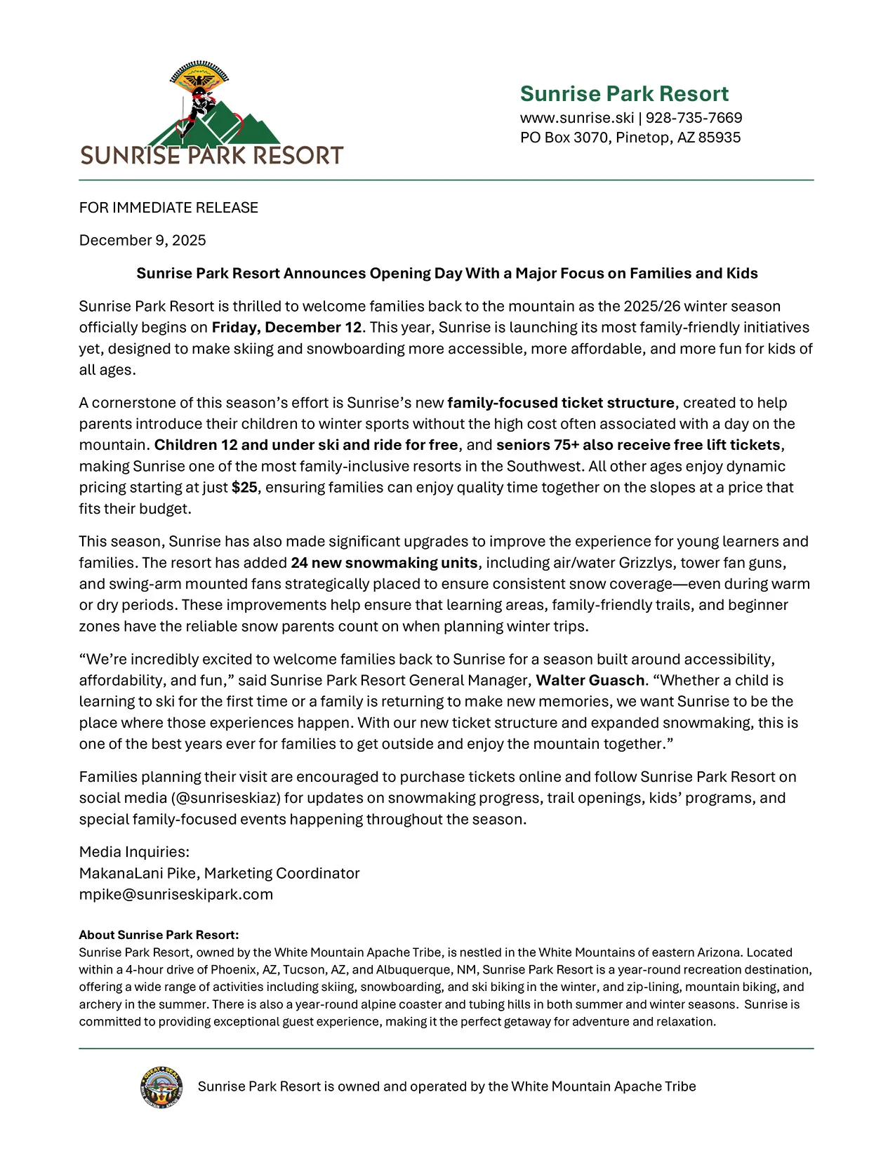 Sunrise Park Resort is thrilled to welcome families back to the mountain as the 2025/26 winter season officially begins on Friday, December 12. This year, Sunrise is launching its most family-friendly initiatives yet, designed to make skiing and snowboarding more accessible, more affordable, and more fun for kids of all ages.