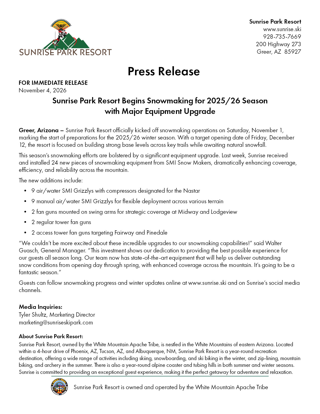 Sunrise Park Resort officially kicked off snowmaking operations on Saturday, November 1, marking the start of preparations for the 2025/26 winter season.